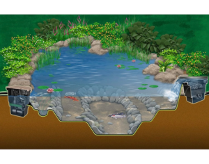 Aquascape “Ecosystem” pond system is designed to maintain excellent water quality by utilizing the natural bacteria present in our ponds. The system consists of a skimmer to remove larger particles, before the water is pumped to a BioFalls filter. The filtered water is then returned to the pond, either directly or via a watercourse. Rocks and gravel are also placed within the pond itself to provide further habitat for bacteria, and plants can be used to help maintain oxygen levels.