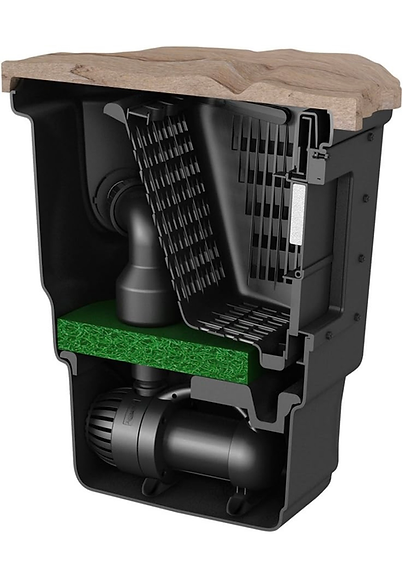 This mechanical filtration step is important as it prevents large amounts of organic material from breaking down inside the pond, helping to prevent the spikes in nutrients that often encourage blooms of algae. The skimmer comes in three sizes and should be installed on the opposite side of the pond to any watercourses to maximize the circulation of water. The 400 and 1000 models feature a faux rock lid to help camouflage the skimmer