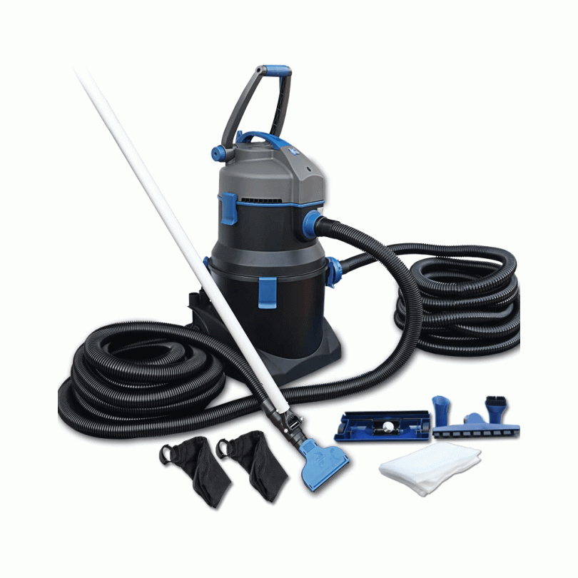 The PondoVac 5 is an incredibly versatile option for pond cleaning, providing a continuous cleaning experience with a higher flow rate of 8000 litres per hour. It comes with a built-in pump to efficiently carry away waste water, even uphill. The system is designed with two chambers that are filled and emptied in alternate cycles, activated by a mechanical valve when one chamber is full. The discharge hose is easily connected and can pump waste water up to 10 meters away, making it perfect for household wet and dry vacuum applications. The PondoVac 5 has bigger, rugged wheels and a foldable handle, making it easy to move around the garden. Its tube extensions help you clean those hard-to-reach corners, and it has four suction nozzles, including one for string algae. The product dimensions are Ø 395mm, height 670mm, cable length 7.5m, suction hose 5m, discharge hose 10m.