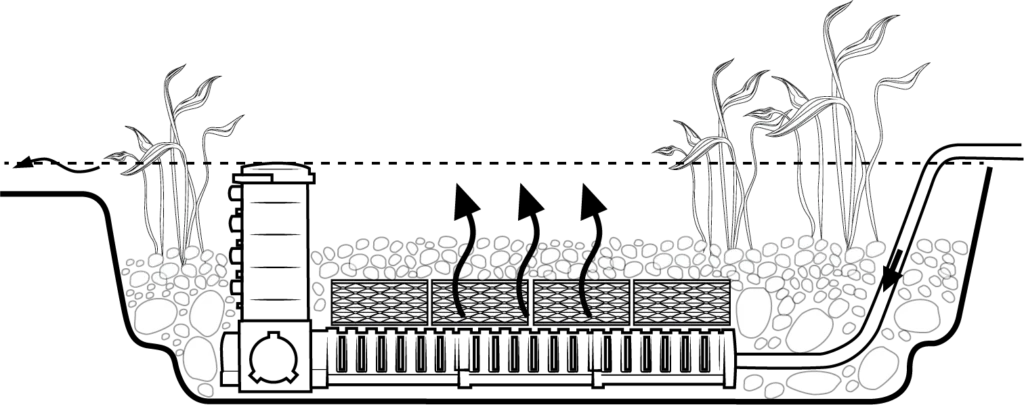 At 1m deep the approximate filtering capacity: 185,000 litres (This will be affected by stocking, planting, and environmental factors)